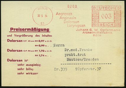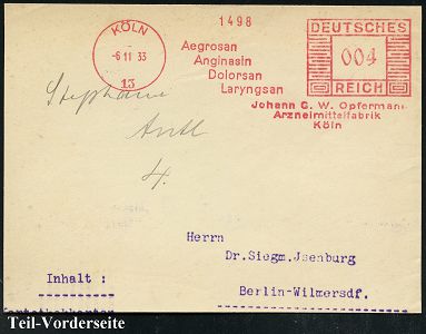 9146 | 12 € | 5000 KÖLN (Absender-Freistempel) : KÖLN/ 13/ Aegrosan/ Anginasin/ Dolorsan../ Johann G.W.Opfermann/ Arzneimittelfabrik 1933 (6.11.) AFS Francotyp "Mäanderrechteck" auf Teil-Vorderseite, vergl. Kat.-Nr. 9150 (Dü.E-2CEh) | ![]() | |