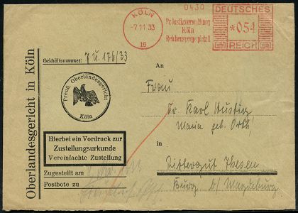 9147 | 25 € | 5000 KÖLN (Absender-Freistempel) : KÖLN/ 6/ Pr.Justizverwaltung/ Köln/ Reichenspergerplatz 1 1933 (7.11.) AFS Francotyp "Mäanderrechteck" *054 Pf. , Dienst-Bf.: Oberlandesgericht in Köln.. Zustellungsurkunde (alter preuß. Adler der Weimarer Republik!) Fern-ZU. n. Burg/Magdeburg, seltenes Porto! (Dü.E-1BAh) | ![]() | |
