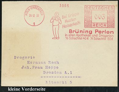 9148 | 15 € | 5000 KÖLN (Absender-Freistempel) : KÖLN-EHRENFELD/ 1/ Bei Grippe/ Husten../ Brüning Perlen/ in allen Apotheken u.Drogerien.. 1933 (29.12.) seltener AFS Francotyp "Mäanderrechteck" (mann fasst sich an den Hals) schwache Bräuniúng, Bedarfs-Vorderseite (Dü.E-2CEh) | ![]() | |