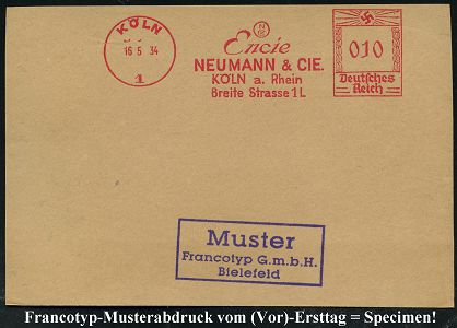 9150 | 35 € | 5000 KÖLN (Absender-Freistempel) : KÖLN/ 1/ Encie/ NEUMANN & CIE./ KÖLN.. 1934 (16.5.) AFS-Musterabdruck Francotyp "Hakenkreuz" (Monogr.-Logo) glasklar gest. Francotyp-Musterblatt vom (Vor)-Ersttag !, selten! (Dü.E-3CEo) | ![]() ![]() | |