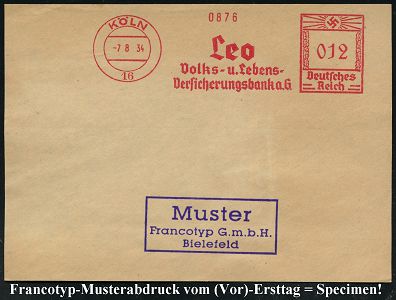 9152 | 35 € | 5000 KÖLN (Absender-Freistempel) : KÖLN/ 16/ Leo/ Volks-u.Lebens-/ Versicherungsbank a.G. 1934 (7.8.) AFS-Musterabdruck Francotyp "Hakenkreuz" , glasklar gest. Francotyp-Musterblatt vom (Vor)-Ersttag !, selten! (Dü.E-3CEh) | ![]() ![]() | |