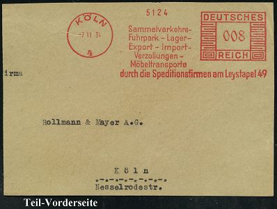 9156 | 12 € | 5000 KÖLN (Absender-Freistempel) : KÖLN/ 4/ Sammelverkehre-/ Fuhrpark-Lager-/ Export../ Möbeltransporte/ durch die Speditionsfirmen am Leystapel 49 1934 (7.11.) AFS Francotyp "Mäanderrechteck" auf Teil-Vorderseite (Dü.E-2CEh) | ![]() | |
