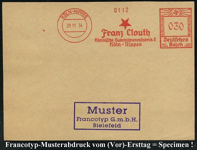 9157 | 35 € | 5000 KÖLN (Absender-Freistempel) : KÖLN-NIPPES/ Franz Clouth/ Rheinische Gummiwarenfabrik AG.. 1934 (29.11.) AFS-Musterabdruck Francotyp "Hakenkreuz" (Stern) glasklar gest. Francotyp-Musterblatt vom (Vor)-Ersttag !, selten! (Dü.E-3CEh) | ![]() ![]() | |