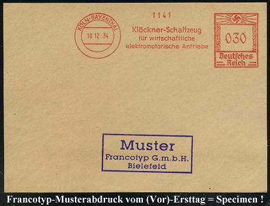 9159 | 35 € | 5000 KÖLN (Absender-Freistempel) : KÖLN-BAYENTHAL/ Klöckner-Schaltzeug/ für../ elektromotorische Antriebe 1934 (10.12.) AFS-Musterabdruck Francotyp "Hakenkreuz" , glasklar gest. Francotyp-Musterblatt vom (Vor)-Ersttag !, selten! (Dü.E-3CEh) | ![]() ![]() | |