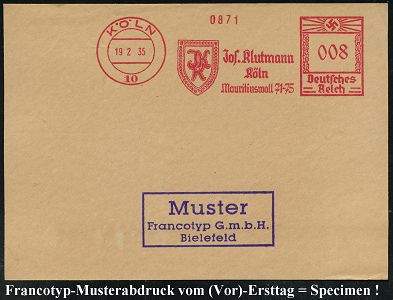 9162 | 35 € | 5000 KÖLN (Absender-Freistempel) : KÖLN/ 10/ Jos.Klutmann/ Köln.. 1935 (19.2.) AFS-Musterabdruck Francotyp "Hakenkreuz" (monogr.-Logo) glasklar gest. Francotyp-Musterblatt vom (Vor)-Ersttag !, selten! (Dü.E-3CEh) | ![]() ![]() | |
