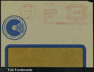9166 | 14 € | 5000 KÖLN (Absender-Freistempel) : KÖLN/ 5/ Kranksein/ bringt Not!/ Es hilft/ die/ Central-Krankenversicherung AG 1935 (2.3.) AFS Francotyp "Bogenrechteck" auf Teil-Vorderseite: 1913 CENTRAL KRANKENVERSICHERUNGS AG (Dü.E-1CEh) | ![]() | |