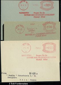 9168 | 25 € | 5000 KÖLN (Absender-Freistempel) : KÖLN (RHEIN)/ 1/ ..DEUTSCHE BANK UND DISCONTO-GESELLSCHAFT/ FILIALE KÖLN 1935/37 3 verschiedene AFS Francotyp "Bogenrechteck" , je auf Teil-Vorderseite, 3 Belege (Dü.E-1Am, E-1CBh, E-1AGh = seltene Type!) | ![]() | |