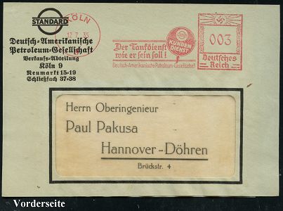 9172 | 15 € | 5000 KÖLN (Absender-Freistempel) : KÖLN/ 9/ Der Tankdienst/ wie er sein soll!/ Deutsch-Amerikanische Petroleum-Gesellschaft 1935 (12.7.) AFS Francotyp "Hakenkreuz" (Werbe-Kelle "STANDARD" = US-Rockefeller-Konzern) Vedarfs-Vorderseite (Dü.E-3CEo) | ![]() | |