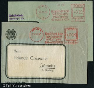 9178 | 30 € | 5000 KÖLN (Absender-Freistempel) : KÖLN 4/ Hansestadt Köln/ Seid Sozialisten/ der Tat! Opfert/ für das WHW 1935-36 #bzw.# WHW 1937-38 1935/37 2 verschiedene AFS Francotyp "Hakenkreuz" auf Teil-Vorderseite bzw. Dienst-Vorderseite (Einzelverkauf möglich: je 18.- EUR), 2 Belege (Dü.E-3Ah, jeweils nur kurze Verwendung im Herbst) | ![]() | |