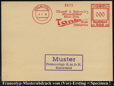9179 | 30 € | 5000 KÖLN (Absender-Freistempel) : KÖLN-POLL/ Munk & Schmitz/ AG/ ..Tanks für alle/ Flüssigkeiten 1936 (4.1.) AFS-Musterabdruck Francotyp "Hakenkreuz" in 000 , glasklar gest. Francotyp-Musterblatt vom (Vor)-Ersttag !, selten! (Dü.E-3CEh) | ![]() ![]() | |