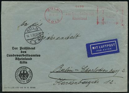 9181 | 25 € | 5000 KÖLN (Absender-Freistempel) : KÖLN-/ SÜLZ/ Landesarbeitsamt/ Rheinland 1936 (13.1.) AFS Francotyp "Mäanderrechteck" 022 Pf. + 1K-Brücke: KÖLN/H 1 m , Inl.-Flugpost-Dienst-Bf.: Der Präsident des Landesarbeitsamtes Rheinland noch mit Weimarer Adler, seltene Portostufe (Dü.E-2CEh) | ![]() | |