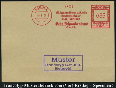 9182 | 35 € | 5000 KÖLN (Absender-Freistempel) : KÖLN 7/ Küchenmaschinen u.Geräte/ Konditorei-Bedarf/ Glas-Porzellan/ Gebr.Schwabenland/ GmbH 1936 (19.1.) AFS-Musterabdruck Francotyp "Hakenkreuz" , glasklar gest. Francotyp-Musterabdruck vom (Vor)-Ersttag !, selten! (Dü.E-3CEh) | ![]() ![]() | |