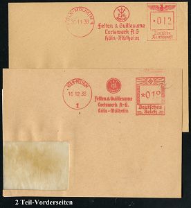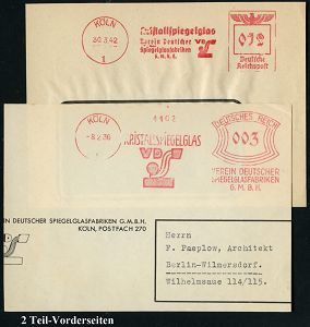 9183 | 20 € | 5000 KÖLN (Absender-Freistempel) : KÖLN/ 1/ KRISTALLSPIEGELGLAS/ VEREIN DEUTSCHER/ SPIEGELGLASFABRIKEN/ GMBH 1936/42 2 verschiedene AFS Francotyp "Bogenrechteck" bzw. "Reichsadler" (je Firmen-Logo VDS) je Teil-Vorderseite, 2 Belege (Dü.E-1BAh, E-5BAo) | ![]() | |