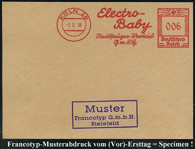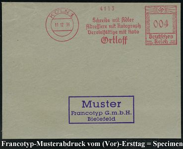 9184 | 35 € | 5000 KÖLN (Absender-Freistempel) : KÖLN 10/ Electro-/ Baby/ Staubsauger-Vertrieb/ GmbH 1936 (2.3.) AFS-Musterabdruck Francotyp "Hakenkreuz", Text teils Sütterlin , glasklar gest. Francotyp-Musterblatt vom (Vor)-Ersttag !, selten! (Dü.E-3CEo) | ![]() ![]() | |