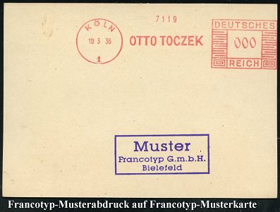 9185 | 25 € | 5000 KÖLN (Absender-Freistempel) : KÖLN/ 1/ OTTO TOCZEK 1936 (10.3.) AFS-Musterabdruck Francotyp "Mäanderrechteck" in 000 , klar gest. Francotyp-Musterkarte (Dü.E-2CEh) | ![]() ![]() | |