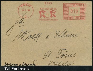 9190 | 12 € | 5000 KÖLN (Absender-Freistempel) : KÖLN/ 7/ Man kauft gut bei/ K & K/ Köln.. 1936 (24.7.) AFS Francotyp "Mäanderrechteck" , klar gest. Bedarfs-Teil-Vorderseite (Dü.E-2CEh) | ![]() | |