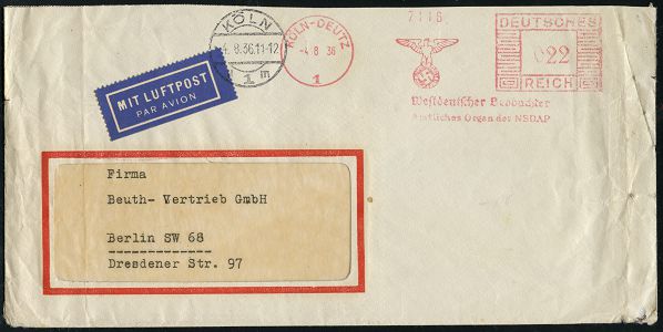 9191 | 25 € | 5000 KÖLN (Absender-Freistempel) : KÖLN-DEUTZ/ 1/ Westdeutscher Beobachter/ Amtl.Organ der NSDAP 1936 (4.8.) AFS Francotyp "Mäanderrechteck" 022 Pf. (NS-Adler mit Hakenkreuz) + 1K-Brücke: KÖLN/u 1 m (Bf. rechts kl. Randmäng.), Inl.-Flp.-Bf., seltenes Porto! (Dü.E-2CEh) | ![]() | |