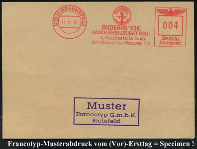 9198 | 35 € | 5000 KÖLN (Absender-Freistempel) : KÖLN-BRAUNSFELD/ BUDERUS/ 1731/ BUDERUS*SCHE/ HANDELSGES.M.B.H... 1936 (11.11.) AFS-Musterabdruck Francotyp "Reichsadler" (Firmenlogo mit Anker = Metall verarbeitender Betrieb) glasklar gest. Francotyp-Musterblatt vom (Vor)-Ersttag !, selten! (Dü.E-5CGo) | ![]() ![]() | |