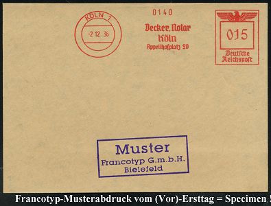 9199 | 35 € | 5000 KÖLN (Absender-Freistempel) : KÖLN 1/ Decker,Notar/ Köln.. 1936 (2.12.) AFS-Musterabdruck Francotyp "Reichsadler" , glasklar gest. Francotyp-Musterblatt vom (Vor)-Ersttag !, selten! (Dü.E-5CGh) | ![]() ![]() | |