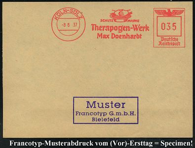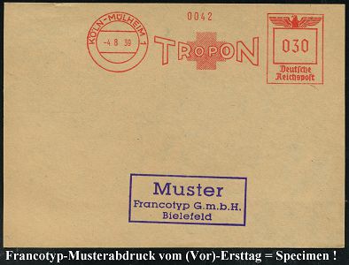 9245 | 35 € | 5000 KÖLN (Absender-Freistempel) : KÖLN-MÜLHEIM 1/ TROPON 1939 (4.8.) AFS-Musterabdruck Francotyp "Reichsadler" (Firmenlogo mit Rotem Kreuz = Pharma-Firma) glasklar gest. Francotyp-Musterblatt vom (Vor)-Ersttag !, selten!, vergl. Kat.-Nrn. 9163 - 65, (Dü.E-5CGh) | ![]() ![]() | |