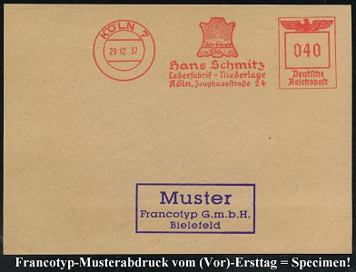 9226 | 35 € | 5000 KÖLN (Absender-Freistempel) : KÖLN 7/ Leder-Schmitz/ Köln/ Hans Schmitz/ Lederfabrik.. 1937 (29.12.) AFS-Musterabdruck Francotyp "Reichsadler" (Logo: Tierhaut) glasklar gest. Francotyp-Musterblatt vom (Vor)-Ersttag !, selten! (Dü.E-5CG) | ![]() ![]() | |