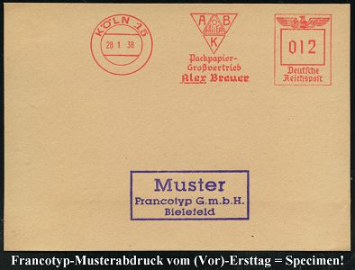 9228 | 35 € | 5000 KÖLN (Absender-Freistempel) : KÖLN 15/ ABK/ PAPIER/ Packpapier-/ Großbetrieb/ Alex Breuer 1938 (28.1.) AFS-Musterabdruck Francotyp "Reichsadler" (Monogr.-Logo) glasklar gest. Francotyp-Musterblatt vom (Vor)-Ersttag !, selten! (Dü.E-5CGo) | ![]() ![]() | |
