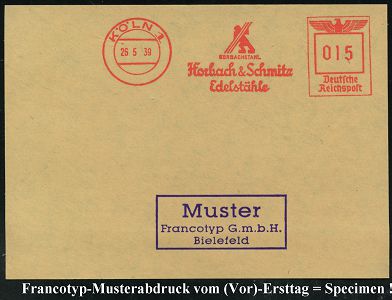 9232 | 35 € | 5000 KÖLN (Absender-Freistempel) : KÖLN 1/ HORBACHSTAHL/ Horbach & Schmitz/ Edelstähle 1939 (26.5.) AFS-Musterabdruck Francotyp "Reichsadler" (Firmenlogo: Figur mit Stahlschine) glasklar gest. Francotyp-Musterblatt vom (Vor)-Ersttag !, selten!, vergl. Kat.-Nr. 9231 (Dü.E-5CGo) | ![]() ![]() | |