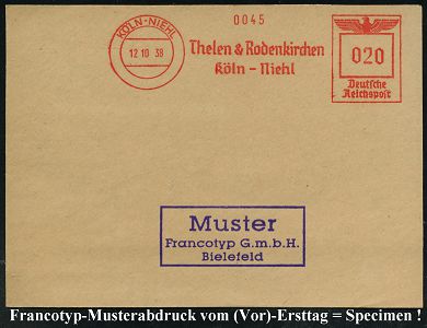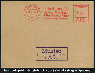 9234 | 35 € | 5000 KÖLN (Absender-Freistempel) : KÖLN-DEUTZ/ Robert Thies & Co./ Holzgroßhandlung/ Köln-Deutz-Hafen/ Sperrholz-Einfuhr 1938 (11.8.) AFS-Musterabdruck Francotyp "Reichsadler" , glasklar gest. Francotyp-Musterblatt vom (Vor)-Ersttag !, selten! (Dü.E-5CGo) | ![]() ![]() | |