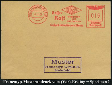 9238 | 35 € | 5000 KÖLN (Absender-Freistempel) : KÖLN-BRAUNSFELD/ CHEMA/ Besser/ Rost verhüten/ als/ entfernen/ Gerhard Collardin vorm.Chema 1938 (3.11.) AFS-Musterabdruck Francotyp "Reichsadler" (Firmen-Logo) glasklar gest. Francotyp-Musterblatt vom (Vor)-Ersttag !, selten! (Dü.E-5CGo) | ![]() ![]() | |
