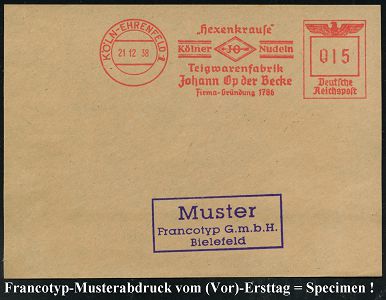 9239 | 35 € | 5000 KÖLN (Absender-Freistempel) : KÖLN-EHRENFELD 1/ "Hexenkrause"/ Kölner JO Nudeln/ Teigwarenfabrik/ Johann Op der Becke.. 1938 (21.12.) AFS-Musterabdruck Francotyp "Reichsadler" (Firmenlogo mit Pfeil) glasklar gest. Francotyp-Musterblatt vom (Vor)-Ersttag !, selten! (Dü.E-5CGo) | ![]() ![]() | |