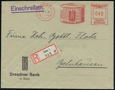 9240 | 28 € | 5000 KÖLN (Absender-Freistempel) : KÖLN 1/ SPARE BEI DER/ DRESDNER BANK 1939 (2.1.) AFS Francotyp "Reichsadler" 042 Pf. = Blech-Sparbüchse + RZ: Köln 1/ l l , Fern-R-Bf. n. Gelsenkirchen, schönes Motiv! (Dü.E-5CEo) | ![]() | |