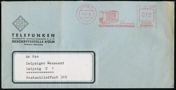 9246 | 23 € | 5000 KÖLN (Absender-Freistempel) : KÖLN 7/ Die neuen/ TELEFUNKEN-WELTEMPFÄNGER 1939 (Aug.) dekorativer AFS Francotyp "Reichsadler" = Weltempfänger (Radio) ab 1939 von den Nazis verboten, da "Feindsender" gehört werden konnten! (Bf. links Falte) Fern-Bf. (Dü.E-5CEh) | ![]() | |