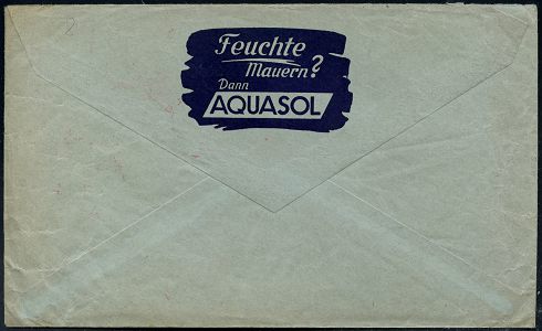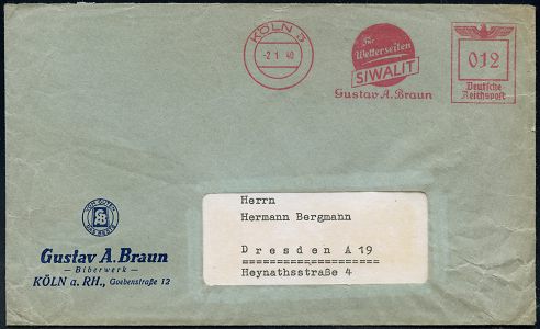 9249 | 25 € | 5000 KÖLN (Absender-Freistempel) : KÖLN 5/ Für/ Wetterseiten/ SIWALIT/ G.A.Braun 1940 (2.1.) AFS Francotyp "Reichsadler" auf Firmen-Reklame-Bf.: Gustav A. Braun, Biberwerk..: "Feuchte Mauern ? Dann AQUASOL" (Dü.E-5CE) | ![]() ![]() | |