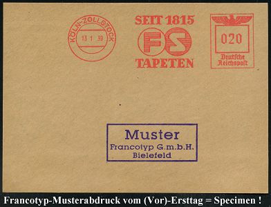 9241 | 35 € | 5000 KÖLN (Absender-Freistempel) : KÖLN-ZOLLSTOCK/ SEIT 1815/ F S/ TAPETEN 1939 (13.1.) AFS-Musterabdruck Francotyp "Reichsadler" (Monogr.-Logo) glasklar gest. Francotyp-Musterblatt vom (Vor)-Ersttag !, selten! (Dü.E-5CG) | ![]() ![]() | |