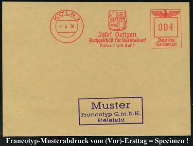9243 | 35 € | 5000 KÖLN (Absender-Freistempel) : KÖLN 1/ OETTGEN/ Josef Oettgen/ Fachgeschäft für Bürobedarfs.. 1939 (1.6.) AFS-Musterabdruck Francotyp "Reichsadler" (Firmenlogo mit Leitz-Ordner, Tintentrockner, Briefumschlag u. Briefpapier) glasklar gest. Francotyp-Musterblatt vom (Vor)-Ersttag !, selten! (Dü.E-5CGo) | ![]() ![]() | |