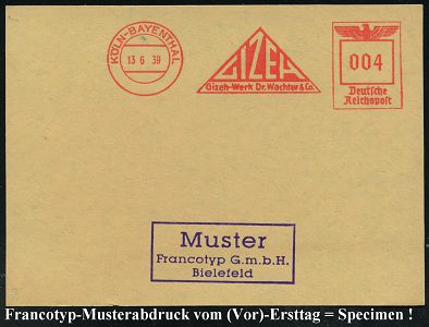 9244 | 35 € | 5000 KÖLN (Absender-Freistempel) : KÖLN-BAYENTHAL/ GIZEH/ Gizeh.Werk Dr.Wachter & Co. 1939 (13.6.) AFS-Musterabdruck Francotyp "Reichsadler" (Firmenlogo in Form einer Pyramide) glasklar gest. Francotyp-Musterblatt vom (Vor)-Ersttag !, selten! (Dü.E-5CGo) | ![]() ![]() | |