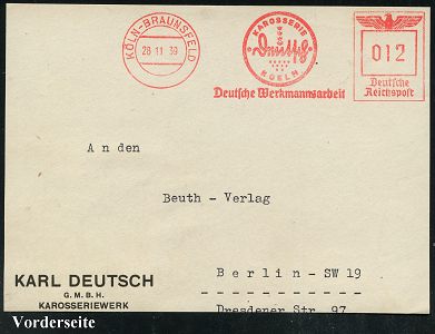 9247 | 15 € | 5000 KÖLN (Absender-Freistempel) : KÖLN-BRAUNSFELD/ KAROSSERIE/ Deutsch/ KOELN/ Deutsche Werkmannsarbeit 1939 (28.11.) AFS Francotyp "Reichsadler", Text teils Sütterlin , Firmen-Vorderseite (Dü.E-5CGo) | ![]() | |