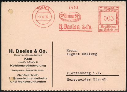 9248 | 16 € | 5000 KÖLN (Absender-Freistempel) : KÖLN 5/ Union/ H.Daelen & Co. 1939 (13.12.) AFS Francotyp "Hakenkreuz" (Union-Brikett mit Bergbauhämmern) Firmen-Kt.: H. Daelen & Co.. Kohlengroßhandlung (links Reg.-Lochung geschl.) mit Text über "Transport-Verteuerung" (Dü.E-3CEh) | ![]() | |