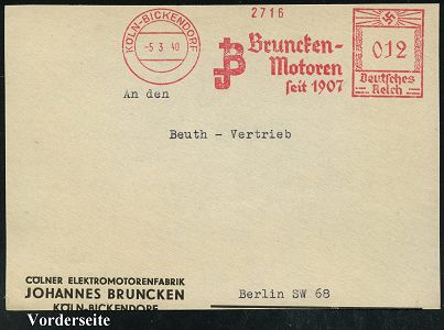 9250 | 16 € | 5000 KÖLN (Absender-Freistempel) : KÖLN-BICKENDORF/ JB/ Bruncken-/ Motoren/ seit 1907 1940 (5.3.) AFS Francotyp "Hakenkreuz" (Monogr.-Logo) Firmen-Vorderseite: CÖLNER ELEKTROMOTORENFABRIK JOHANNES BRUNCHEN.. (Dü.E-3CEh) | ![]() | |