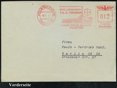 9251 | 16 € | 5000 KÖLN (Absender-Freistempel) : KÖLN-MERHEIM/ (LINKSRHEIN)/ WACHS- u.CERESIN-FABRIK/ TH,C,TROMM.. 1940 (5.6.) AFS Francotyp "Reichsadler" (Firmenlogo u. Fabrik) Bedarfs-Vorderseite (Dü.E-5CGo) | ![]() | |