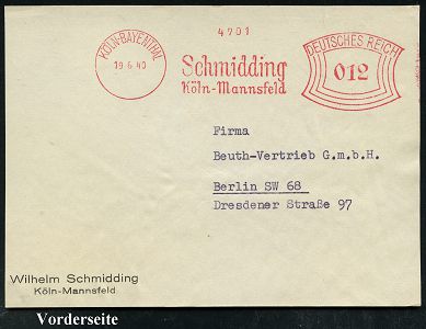 9252 | 15 € | 5000 KÖLN (Absender-Freistempel) : KÖLN-BAYENTHAL/ Schmidding/ Köln-Mannsfeld 1940 (19.6.) AFS Francotyp "Bogenrechteck" , Bedarfs-Vorderseite (Dü.E-1CAh) | ![]() | |
