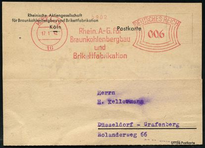 9258 | 18 € | 5000 KÖLN (Absender-Freistempel) : KÖLN/ 16/ Rhein A.-G. für/ Braunkohlenbergbau/ und/ Brikettfabrikation 1942 (17.1.) AFS Francotyp "Bogenrechteck" 006 Pf. auf Firmen-Fernkarte (schwach fleckig) n. Düsseldorf (Dü.E-1CAh) | ![]() | |