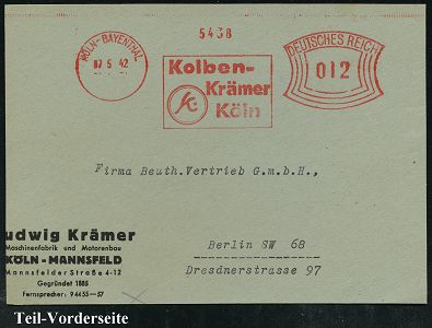 9259 | 15 € | 5000 KÖLN (Absender-Freistempel) : KÖLN-BAYENTHAL/ Kolben-/ Krämer.. 1942 (7.5.) AFS Francotyp "Bogenrechteck" (Monogr.-Logo) Teil-Vorderseite.: Ludwig Krämer, Maschinenfabrik u. Motorenbau.. (Dü.E-1CGh = seltene Type) | ![]() | |