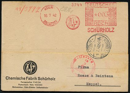 9260 | 30 € | 5000 KÖLN (Absender-Freistempel) : KÖLN-/ ZOLLSTOCK/ Sch/ SCHÜRHOLZ 1942 (16.7.) AFS Francotyp "Mäanderrechteck" 003 Pf. (Monogr.-Logo in Sütterlin) + roter OKW-Zensur-1K: Geprüft/c = Köln, motivgl. Ausl.-Zensur-Firmen-Klapp-Kt. = Chemische Fabrik (auch innen Zensur-1K-Stpl.!) n. Meppel = Europa-Tarif !, seltener Beleg! (Dü.E-2Ah) | ![]() ![]() | |