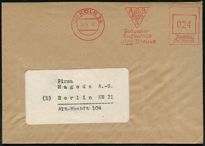 9261 | 28 € | 5000 KÖLN (Absender-Freistempel) : (22) KÖLN 14/ ABK/ PAPIER/ Packpapier-/ Großvertrieb/ Alex Breuer 1946 (25.3.) aptierter AFS Francotyp mit PLZ "Reichsadler" = entfernt = Notmaßnahme! (Monogr.-Logo) , Fern-Bf., vergl. Kat.-Nr. 9228 (Dü.E-13 J-129o) | ![]() | |