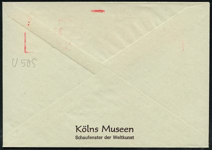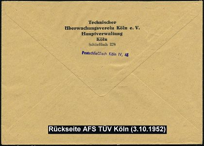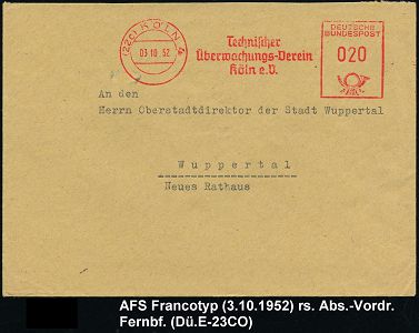 9278 | 15 € | 5000 KÖLN (Absender-Freistempel) : (22c) KÖLN 4/ Techn./ Überwachungs-Verein/ Rheinland eV 1952 AFS Francotyp "Posthorn" , rs. Abs.-Vordruck, Fern-Bf. (Dü.E-23CO) | ![]() ![]() | |