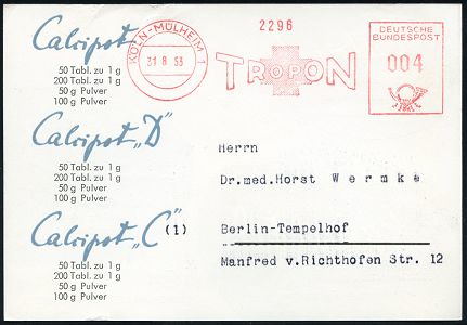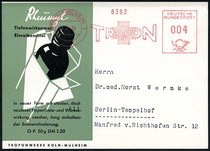 9280 | 18 € | 5000 KÖLN (Absender-Freistempel) : KÖLN-MÜLHEIM 1/ TROPON 1953 (7.7.) AFS Francotyp (Firmen-Logo: Rotes Kreuz) auf zweifarbiger Reklame-Kt.: Rheumyl.. Ophinal.. (Flasche u. Packung) Firmen-Fern-Kt.: TROPONWERKE KÖLN-MÜLHEIM n. West-Berlin (Dü.E-23CGh) | ![]() ![]() | |