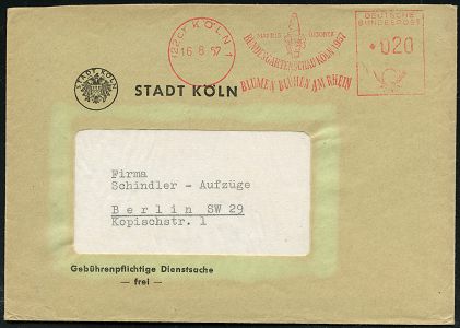 9287 | 16 € | 5000 KÖLN (Absender-Freistempel) : (22c) KÖLN 1/ MAI BIS OKT./ BUNDESGARTENSCHAU../ BLUMEN BLÜHEN AM RHEIN 1957 (16.8.) AFS Francotyp = Clown (mit Blume) Kommunal-Bf.: STADT KÖLN (Dü.E-23DO, nur wenige Monate verwendet) | ![]() | |