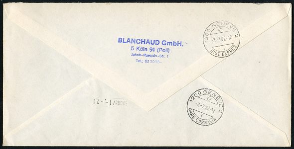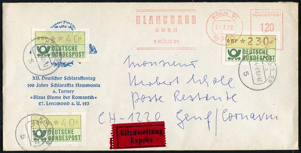 9291 | 20 € | 5000 KÖLN (Absender-Freistempel) : 5000 KÖLN 91/ BLANCHAUD/ GMBH.. 1982 (1.7.) AFS Francotyp 120 Pf. auf ATM 230 Pf. + 2x 40 Pf. gest. 1K-Segment: 5 KÖLN 91/a auf illustriertem Sonderumschlag.: XII. Deutscher Schlaraffentag, 100 Jahre Schlaraffia Hammonia.., Ausl.-Eil-Bf. n. Genf, rs. AS. (Mi.1 + AFS.Dü. E-26) | ![]() ![]() | |