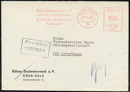 9292 | 12 € | 5000 KÖLN (Absender-Freistempel) : 5 KÖLN-SÜLZ 1/ Kölner Studentenwerk e.V./ ..fördert den akademischen/ Nachwuchs! 1962 (28.9.) AFS Francotyp auf Vordruck-Bf.: Kölner Studentenwerk e.V... (Dü.E-26) | ![]() | |
